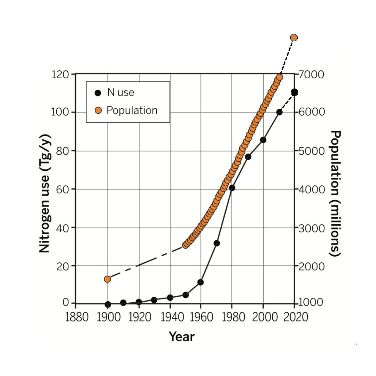 Global population growth in the 20th century mirrors the exponential rise in nitrogen fertiliser use enabled by the energy-intensive Haber-Bosch process.
