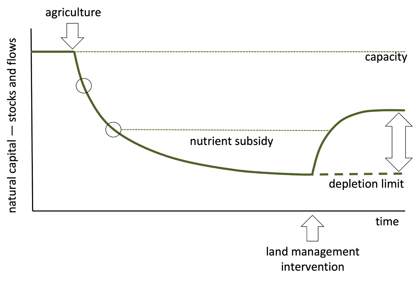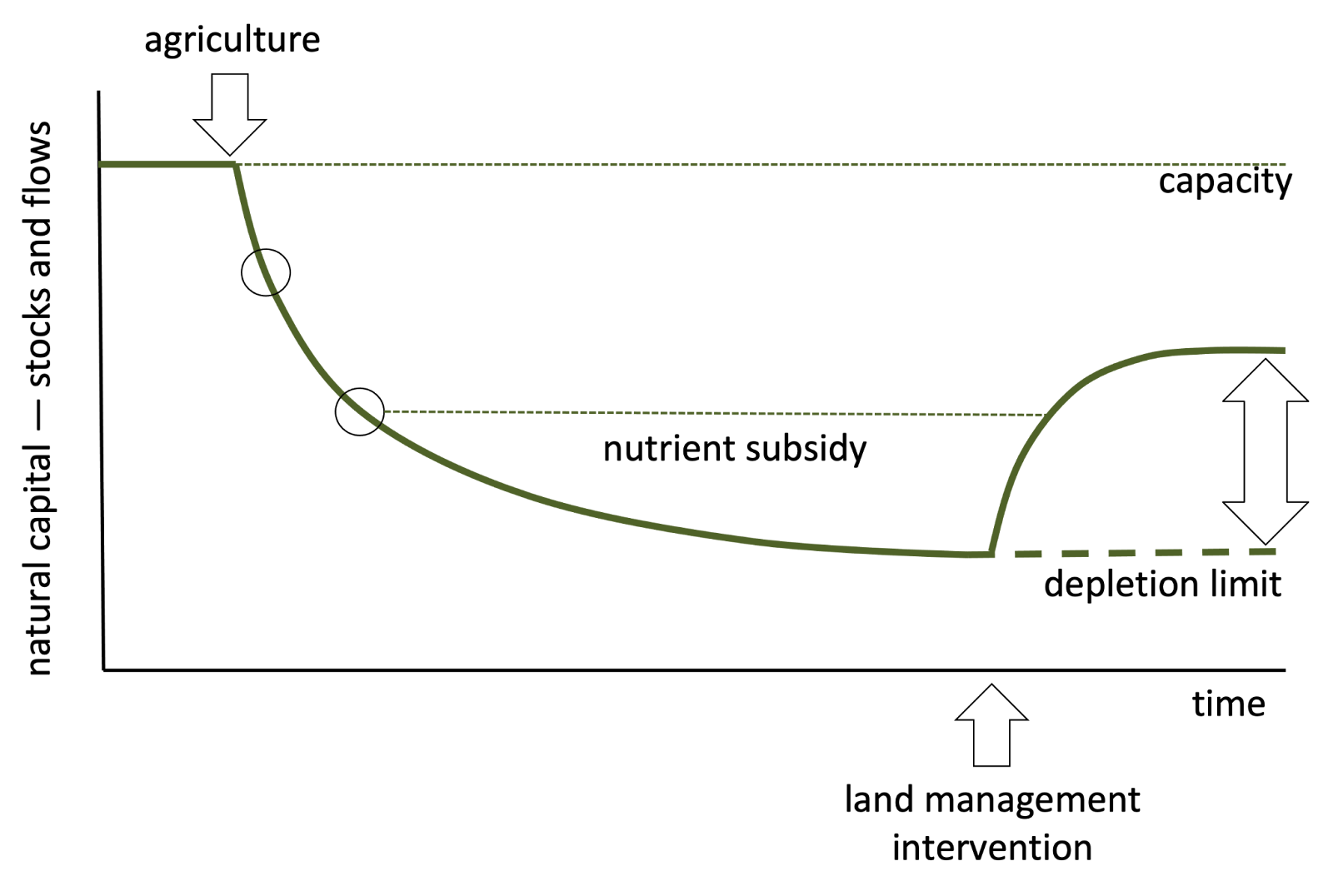 What actions must be taken, and how do they differ from current practices? This is the point of land management intervention in the graph.