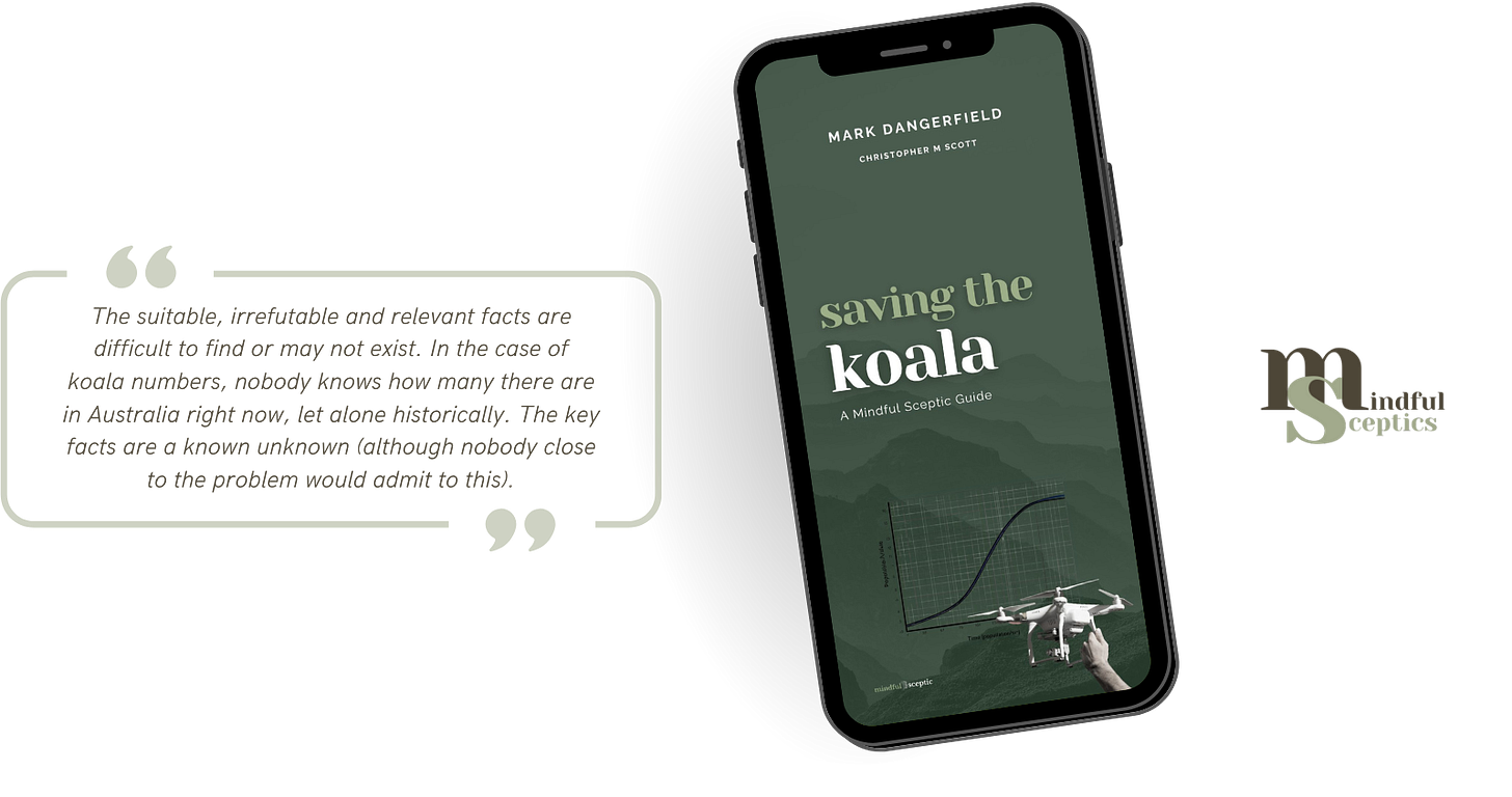 But here’s what the mindful sceptic notices. Emotional campaigns don’t just acknowledge uncertainty; they actively obscure it. They present contestable claims as settled facts. They use normative language like only 329,000 koalas left without explaining what only means in this context.
