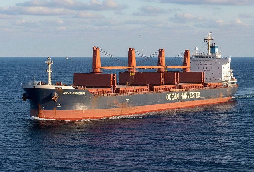 A bulk carrier eases out of port, holds full of pale granules that look like oversized salt. No branding. No romance. Just tonnes.