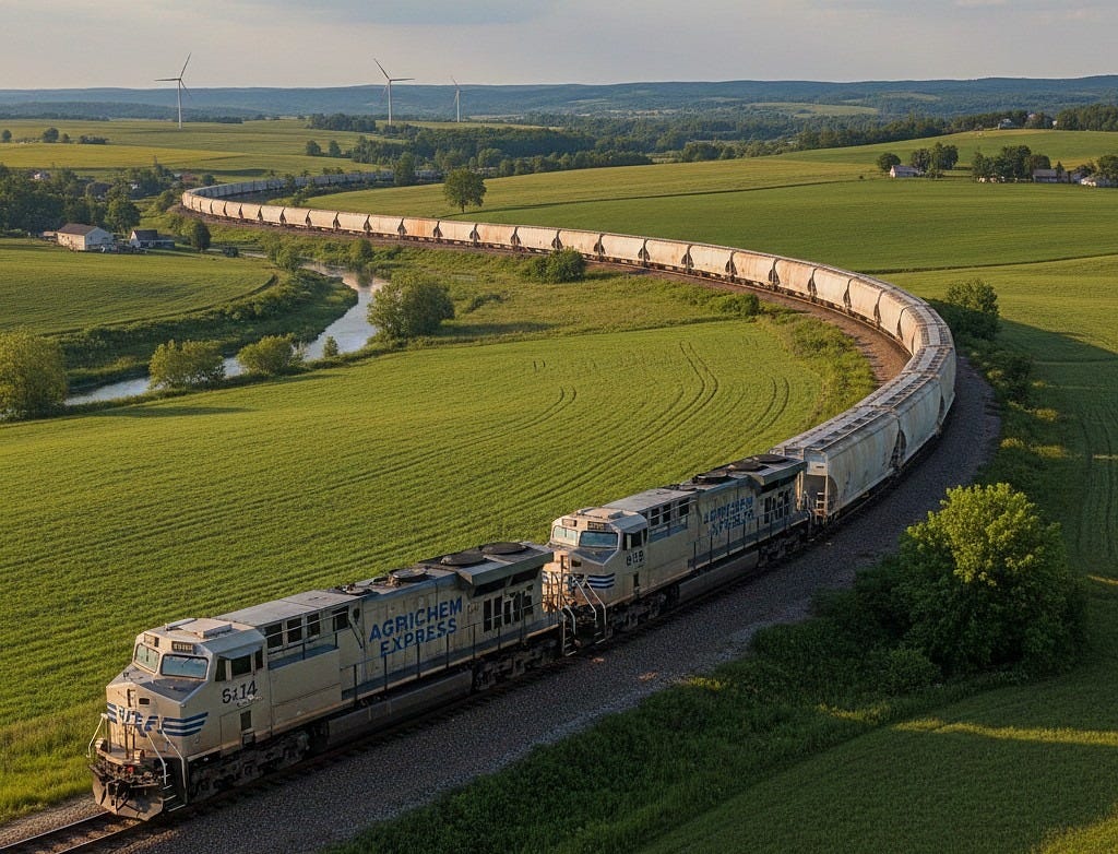 Beyond the green slogans sits an industrial rhythm involving 450 million tonnes of fertiliser turning natural gas into food, constrained by steel hulls, mile-long trains, and deep-water ports.