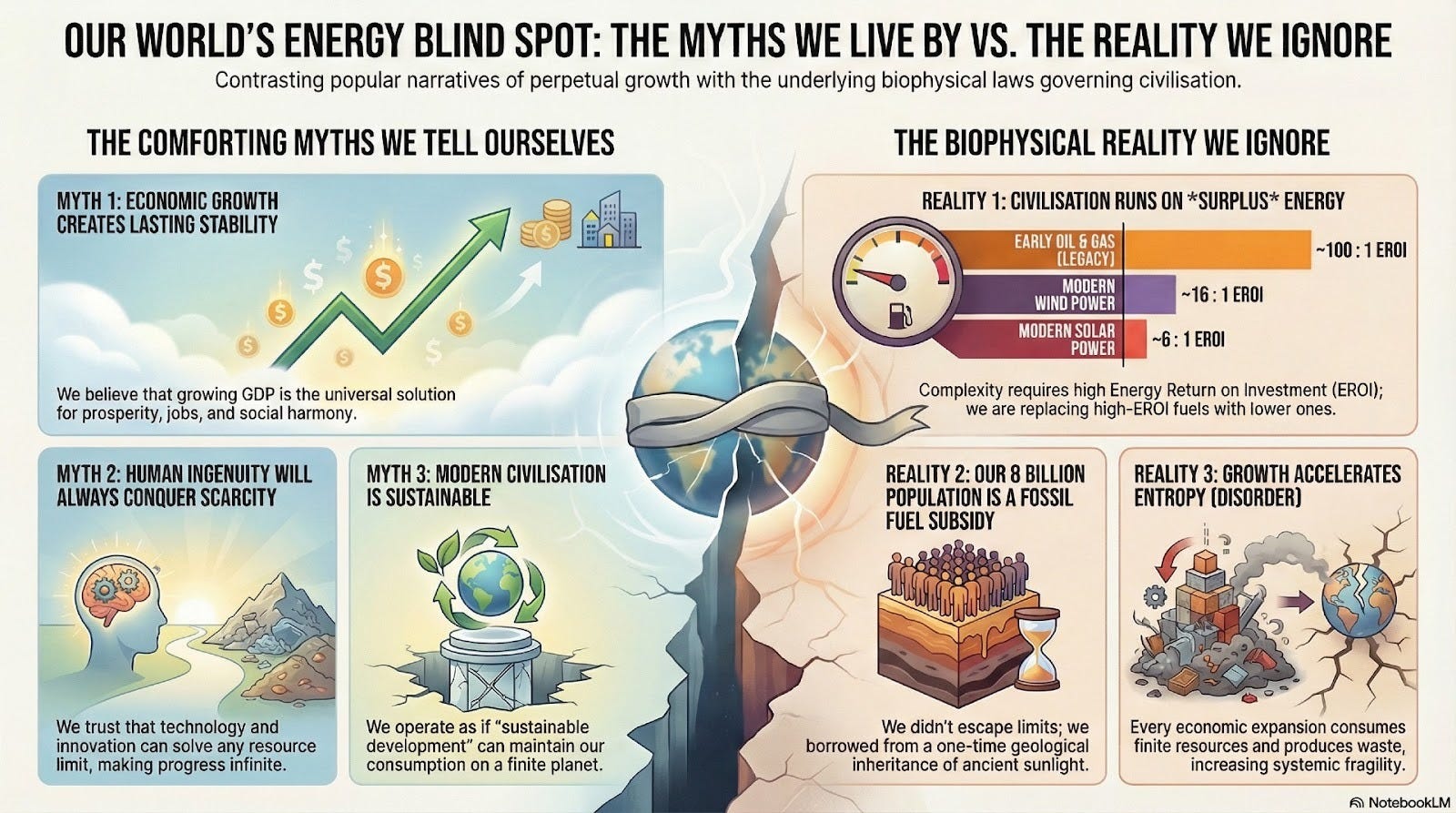 Fossil fuels acted like a civilisation-wide subsidy, not just a convenient fuel source, and EROI is how you see the size of that subsidy. As it declines, carrying capacity tightens, growth becomes a fragility amplifier, and surplus stops being a reliable proxy for security.