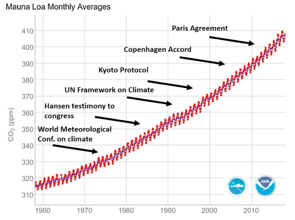 Despite international agreements, accords, protocols, frameworks, and conferences dating back to the 1970s and a host of national-level promises, carbon dioxide concentrations in the atmosphere have continued to rise.