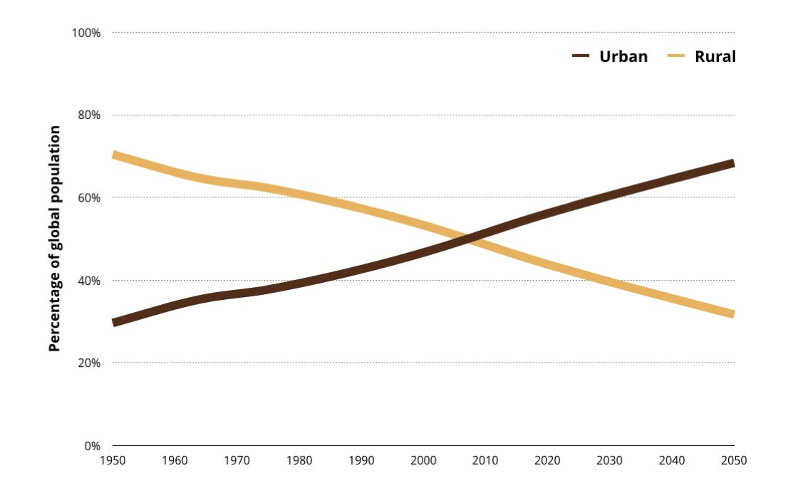 Given the urban growth trend, by 2050 there will be 6.8 billion people in towns and cities fed largely by the efforts of 2.9 billion living in rural areas. This rural population will be 500 million fewer than the current rural population.