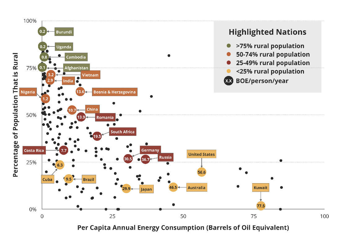Most countries with at least 50% of the population living in rural areas consume less than 10 barrels of oil per person per year. All the high per capita energy-consuming countries have urban populations.